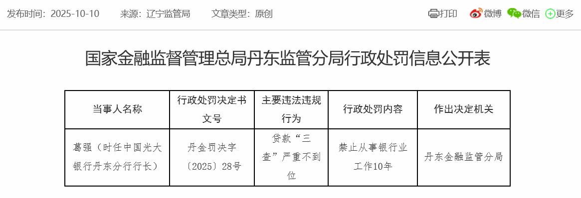 中国经济网北京10月10日讯 国家金融监督管理总局网站今日公布的丹东金融监管分局行政处罚信息公开表(丹金罚决字〔2025〕28号)显示,葛强(时任中国光大银行丹东分行行长)被禁止从事银行业工作10年,主要违法违规行为是贷款“三查”严重不到位。