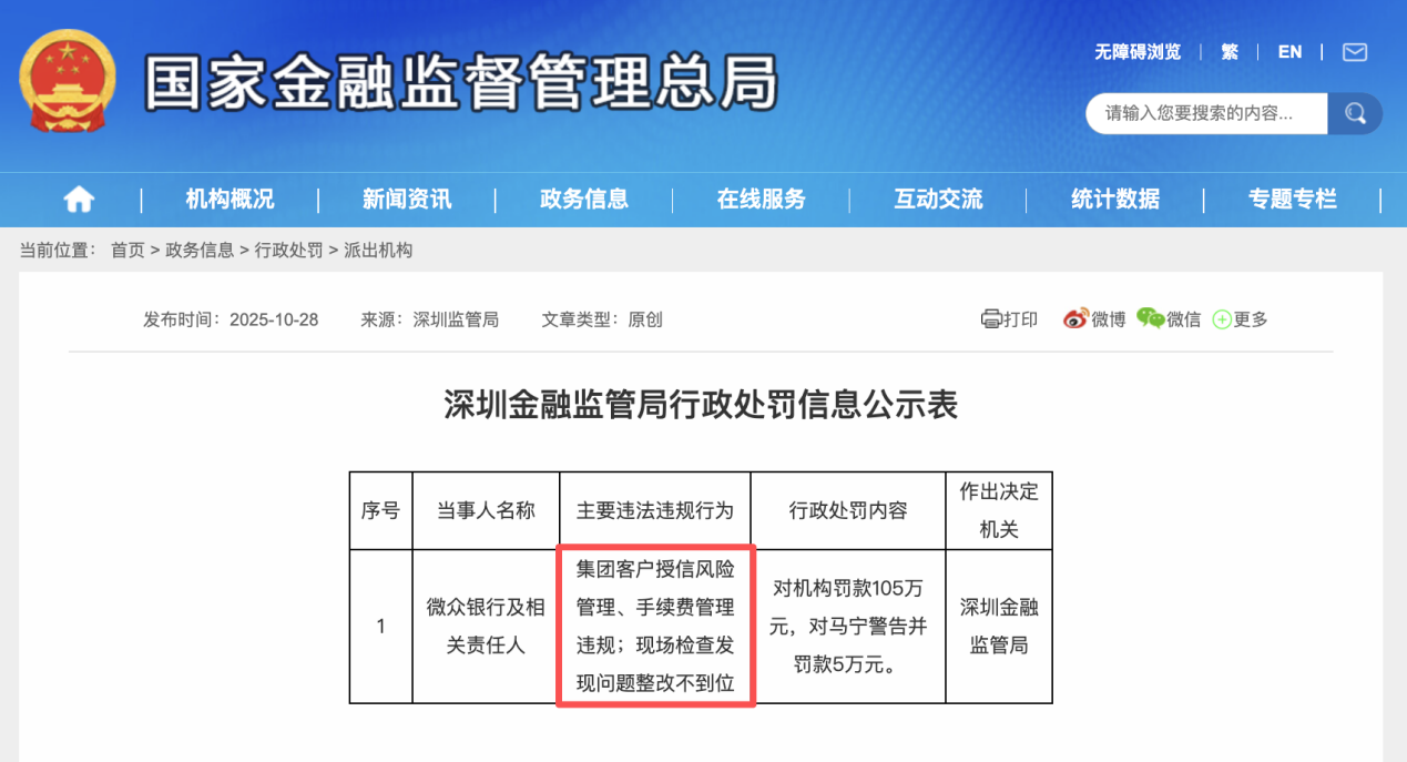 10月28日,国家金融监管总局深圳监管分局公布行政处罚信息显示,因“集团客户授信风险管理、手续费管理违规;现场检查发现问题整改不到位”,微众银行被处罚款共计105万元。