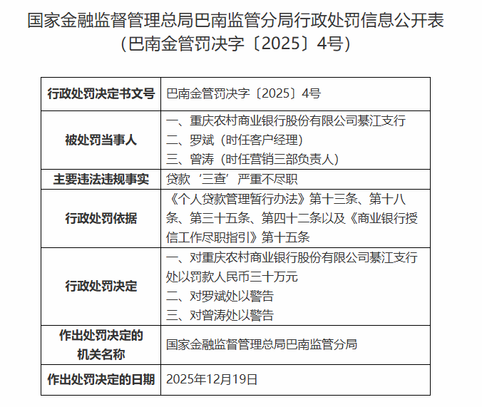 中国经济网北京12月26日讯 国家金融监督管理总局25日发布巴南监管分局行政处罚信息公开表(巴南金管罚决字〔2025〕4号)。重庆农村商业银行股份有限公司(简称“渝农商行”,601077.SH)綦江支行、罗斌(时任客户经理)、曾涛(时任营销三部负责人)存在以下违法违规事实:贷款‘三查’严重不尽职。