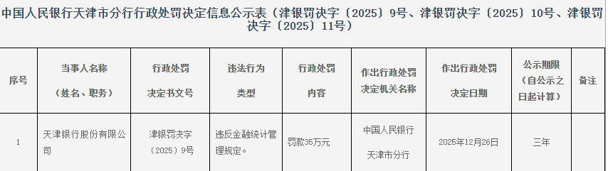 中国经济网北京1月8日讯 中国人民银行网站1月7日发布天津市分行行政处罚决定信息公示表(津银罚决字〔2025〕9号)。天津银行股份有限公司(简称:天津银行,01578.HK)存在以下违法行为:违反金融统计管理规定。中国人民银行天津市分行决定对其处以罚款35万元。
