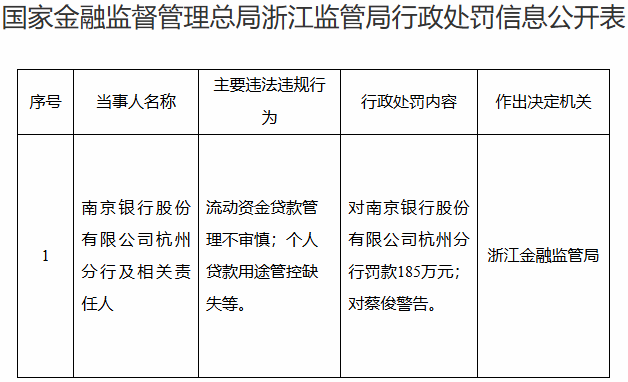 浙江金融监管局对南京银行股份有限公司杭州分行罚款185万元;对蔡俊警告。