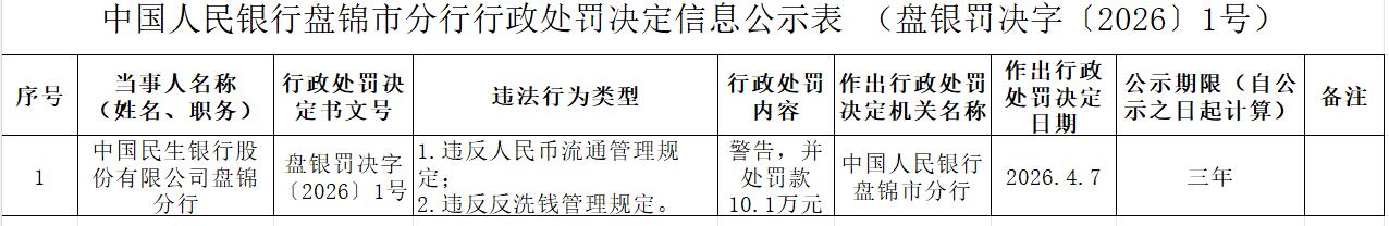 中国经济网北京4月9日讯 中国人民银行辽宁省分行网站4月7日公布的中国人民银行盘锦市分行行政处罚决定信息公示表(盘银罚决字〔2026〕1号)显示,中国民生银行股份有限公司盘锦分行违反人民币流通管理规定、违反反洗钱管理规定。中国人民银行盘锦市分行对其警告,并处罚款10.1万元。